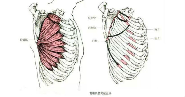 近固定時,使肩胛骨前伸;下部肌纖維收縮可使肩胛骨下降和上迴旋。遠固定時。