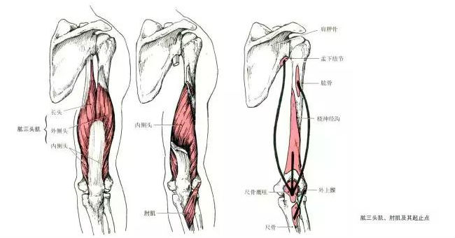 長頭起自肩胛骨盂下結節,外側頭起自肱骨體後面橈神經溝外上方,內側頭起自橈神經溝內下方。