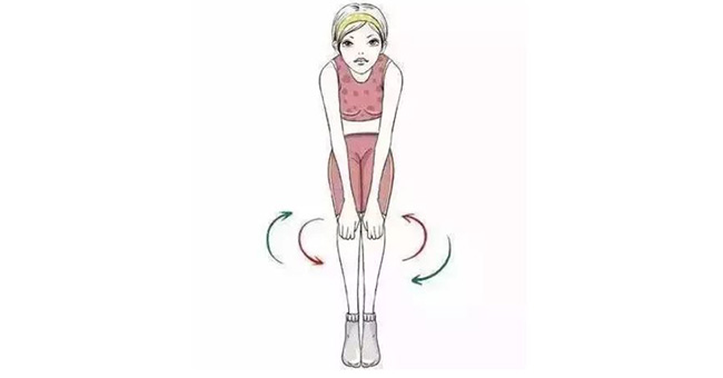 兩足平行併攏,屈膝微下蹲,雙手放在膝蓋上,順時針方向揉動數十次,然後逆時針方向揉動數十次。